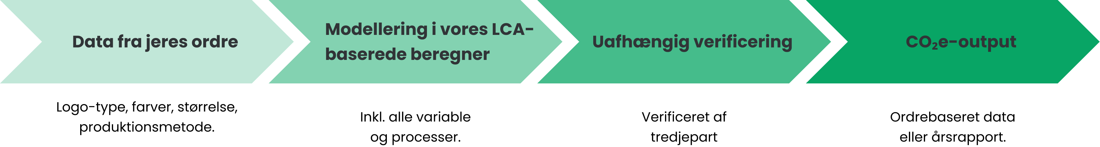 Hvad betyder det for dig som kunde? Det betyder, at I kan få leverandørspecifikke CO2e-aftryk på de produkter som I køber hos os. Vi kan levere CO2e på ordreniveau eller CO2e over fx et regnskabsår til brug for jeres klimaregnskabs scope 3, kategori 1, indkøb af produkter. Vores CO2e-beregningsmodel tager højde for alle variable – dvs. at I som kunde kan få et CO2e-aftryk, der tager højde for bl.a. den konkrete produktionsproces der er brugt, valg af farver og logo-størrelse.